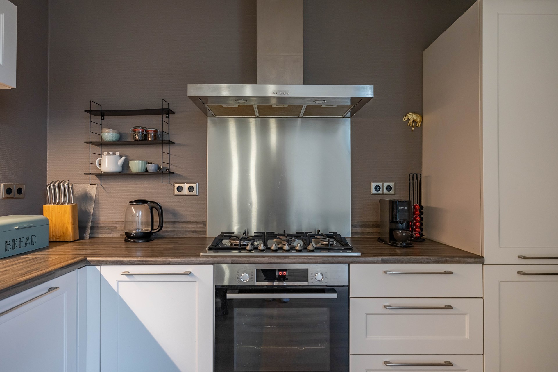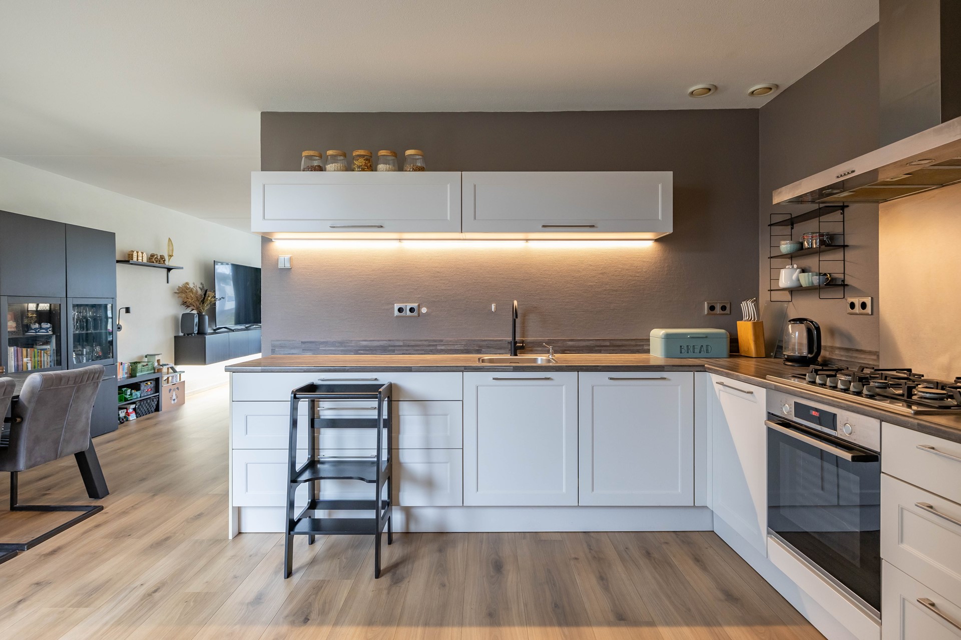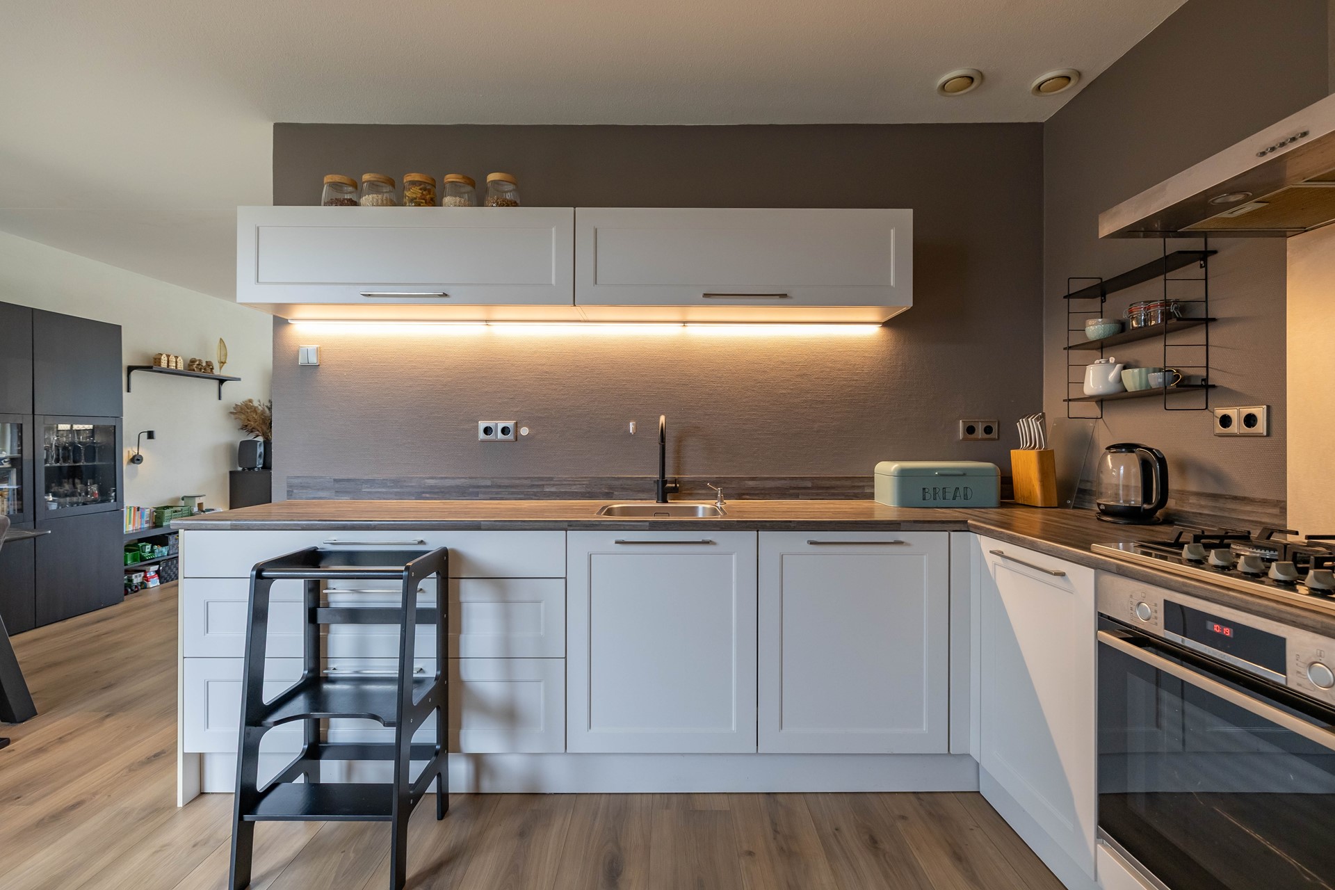 De begane grond beschikt over een nette afgewerkte woonkamer en keuken die in een praktische U-vorm met elkaar verbonden zijn. Zo geniet je van optimale bewegingsvrijheid, terwijl wonen en koken toch duidelijk gescheiden blijven. De keuken heeft een hoekopstelling en is voorzien van diverse inbouwapparatuur. Vanuit de keuken is er een loopdeur naar de ruime en praktische bijkeuken, ideaal voor extra opslag en huishoudelijke taken. Aangrenzend bevindt zich de diepe garage, wat het geheel extra functioneel maakt.