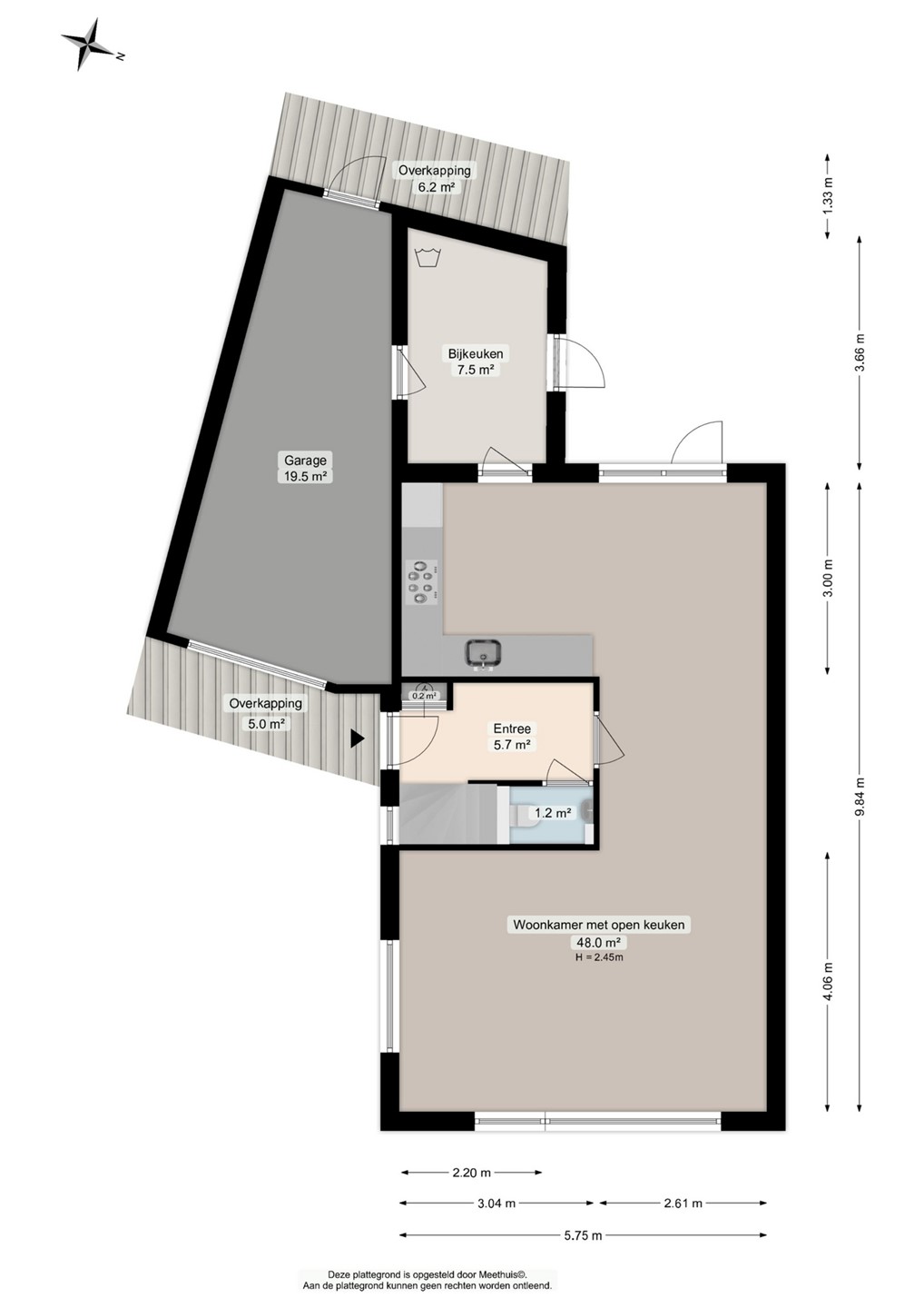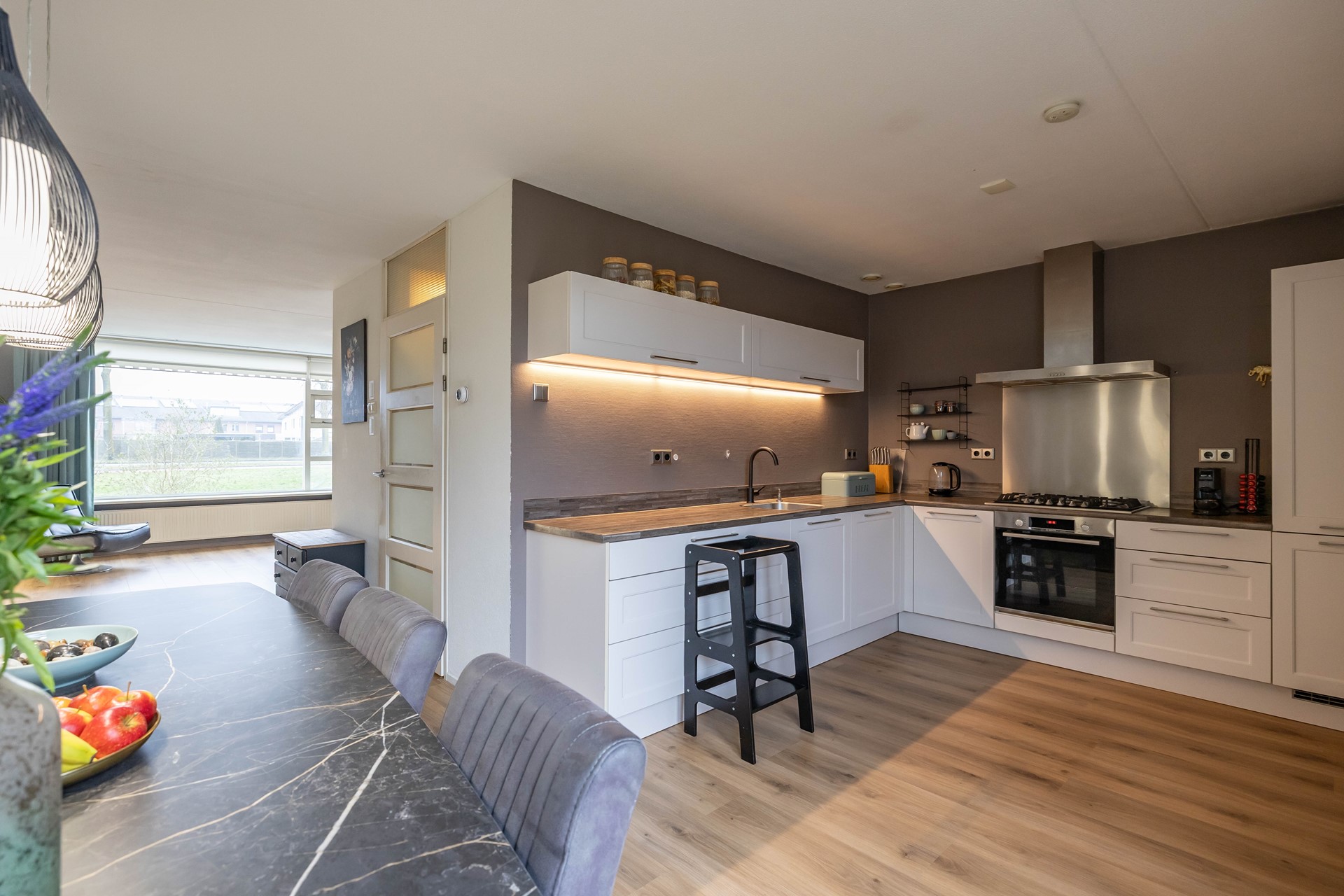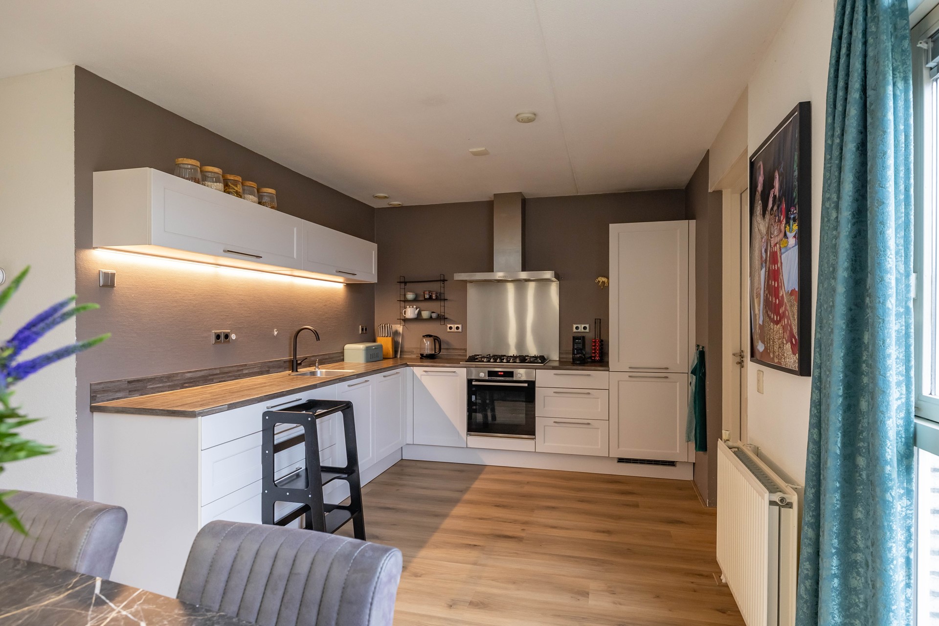 De begane grond beschikt over een nette afgewerkte woonkamer en keuken die in een praktische U-vorm met elkaar verbonden zijn. Zo geniet je van optimale bewegingsvrijheid, terwijl wonen en koken toch duidelijk gescheiden blijven. De keuken heeft een hoekopstelling en is voorzien van diverse inbouwapparatuur. Vanuit de keuken is er een loopdeur naar de ruime en praktische bijkeuken, ideaal voor extra opslag en huishoudelijke taken. Aangrenzend bevindt zich de diepe garage, wat het geheel extra functioneel maakt.
