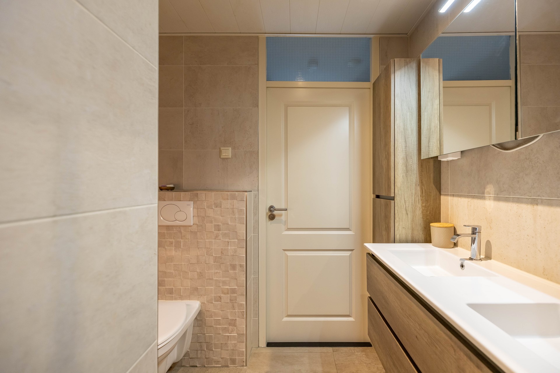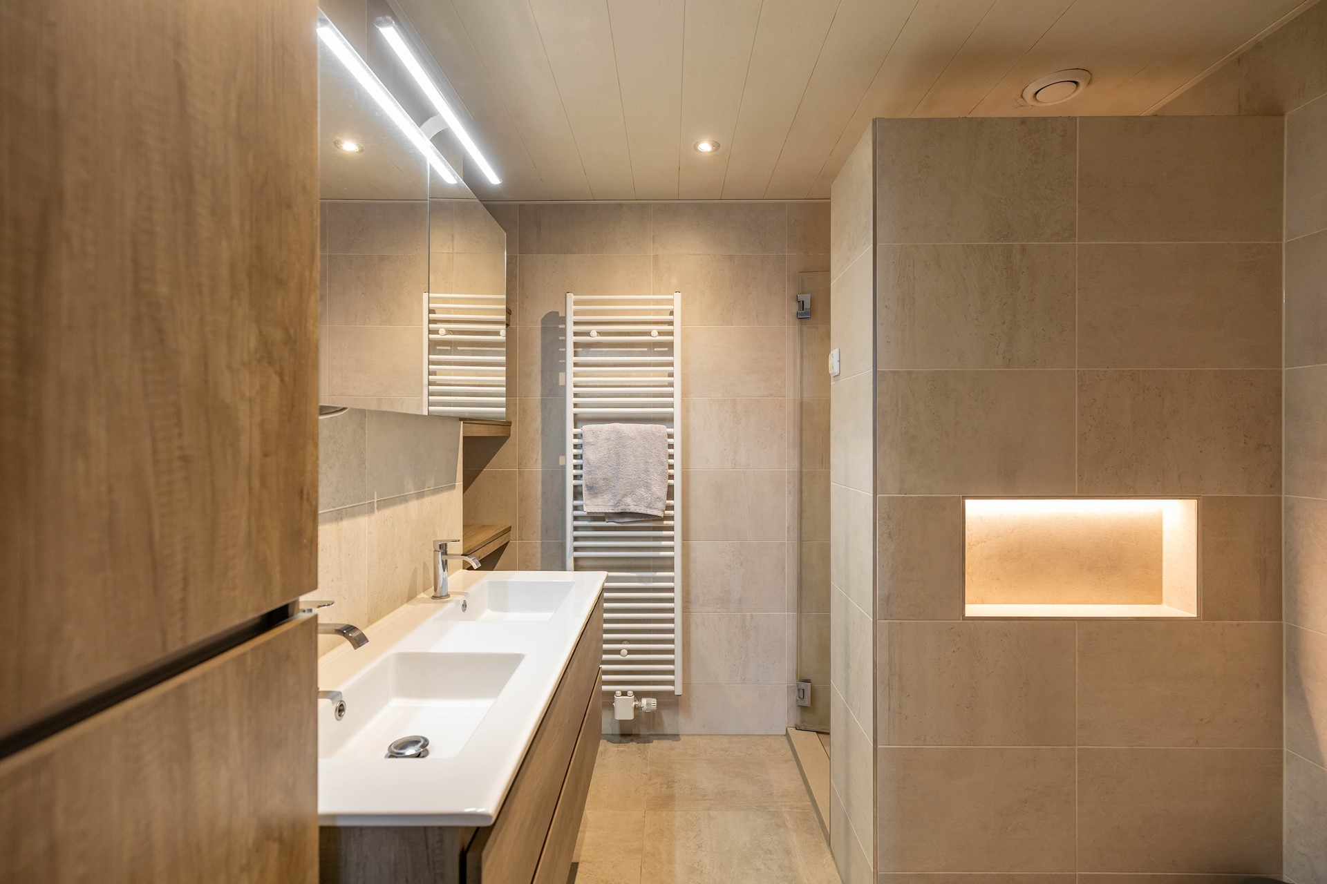 Op de eerste verdieping zijn vier slaapkamers te vinden, waarvan één momenteel is ingericht als walk-in closet. De badkamer is praktisch ingedeeld en maakt optimaal gebruik van de ruimte. Je beschikt hier over een tweepersoons wastafelmeubel, een inloopdouche en een tweede toilet. De stijlvolle afwerking met natuurlijke materialen zorgt voor een moderne en verfijnde uitstraling.