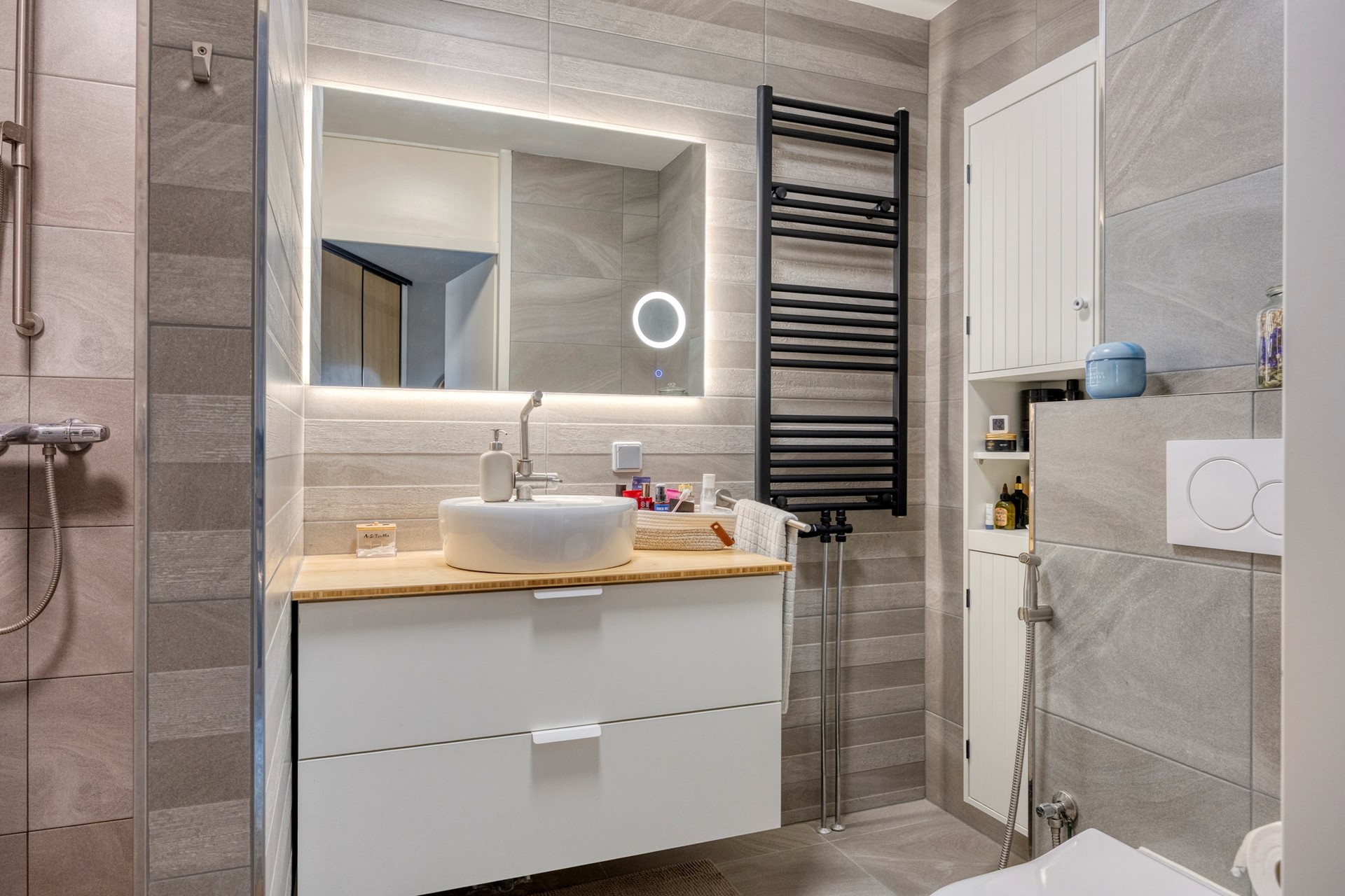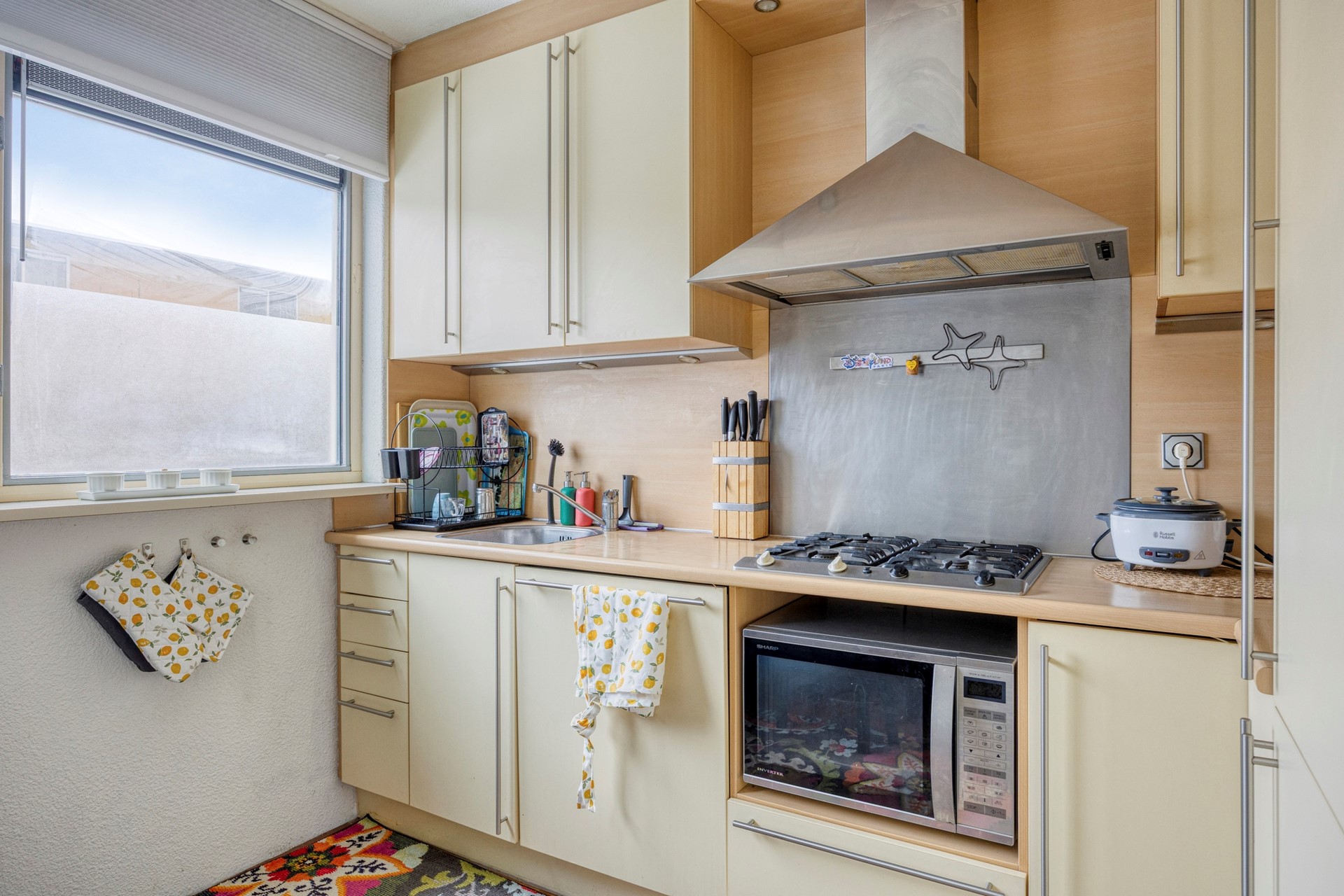 De lichte woonkamer met halfopen keuken is maar liefst 33 m² groot en profiteert van veel daglicht dankzij de glazen schuifpui. De woonkamer is voorzien van een airco die zowel kan koelen als verwarmen. Aan de achterzijde is volop ruimte voor een gezellige zithoek met uitzicht op de tuin. De keuken ligt aan de voorzijde van de woning en is uitgerust met een gaskookplaat, afzuigkap, vaatwasser en een koel-vriescombinatie.
