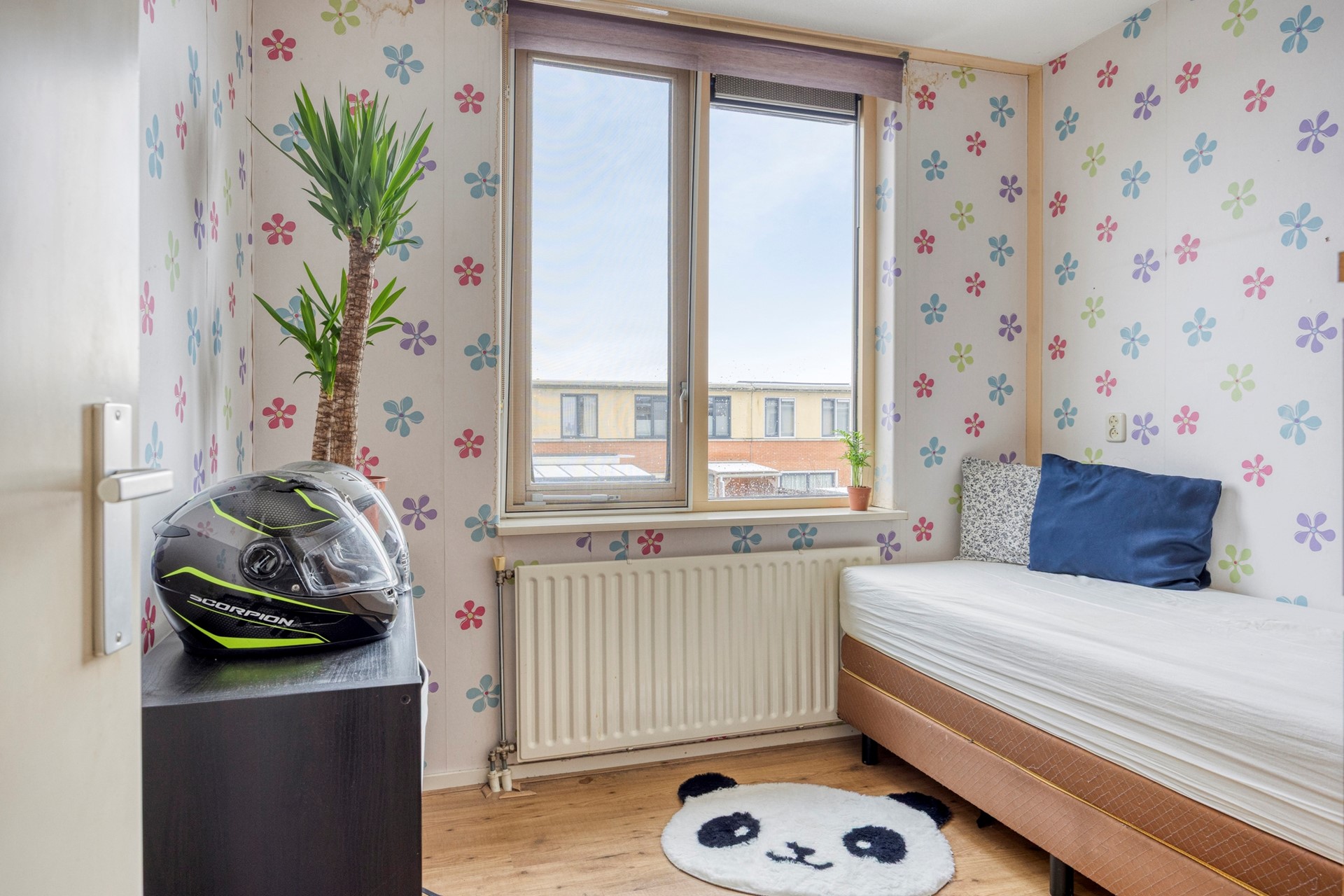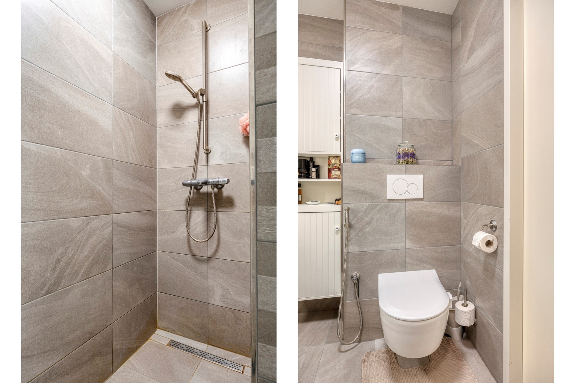 Op de eerste verdieping bevinden zich drie slaapkamers van circa 13 m², 7,5 m² en 6,5 m². De grootste slaapkamer ligt aan de voorzijde en is eveneens voorzien van een airco met koel- en verwarmingsfunctie. De moderne badkamer van circa 4,5 m² is in 2023 volledig gerenoveerd en beschikt over een douche, tweede toilet, wastafelmeubel en handdoekradiator. Op de overloop zijn tevens de aansluitingen voor de wasmachine en droger aanwezig.