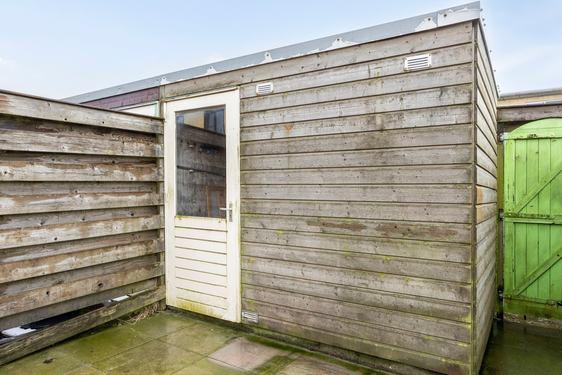 Via de schuifpui bereik je de zonnige achtertuin op het zuiden. Deze is deels betegeld en deels voorzien van gras, waardoor er een fijne combinatie is van terras en groen. De tuin beschikt daarnaast over een achterom en een praktische berging met ruimte voor meerdere fietsen en tuingereedschap.