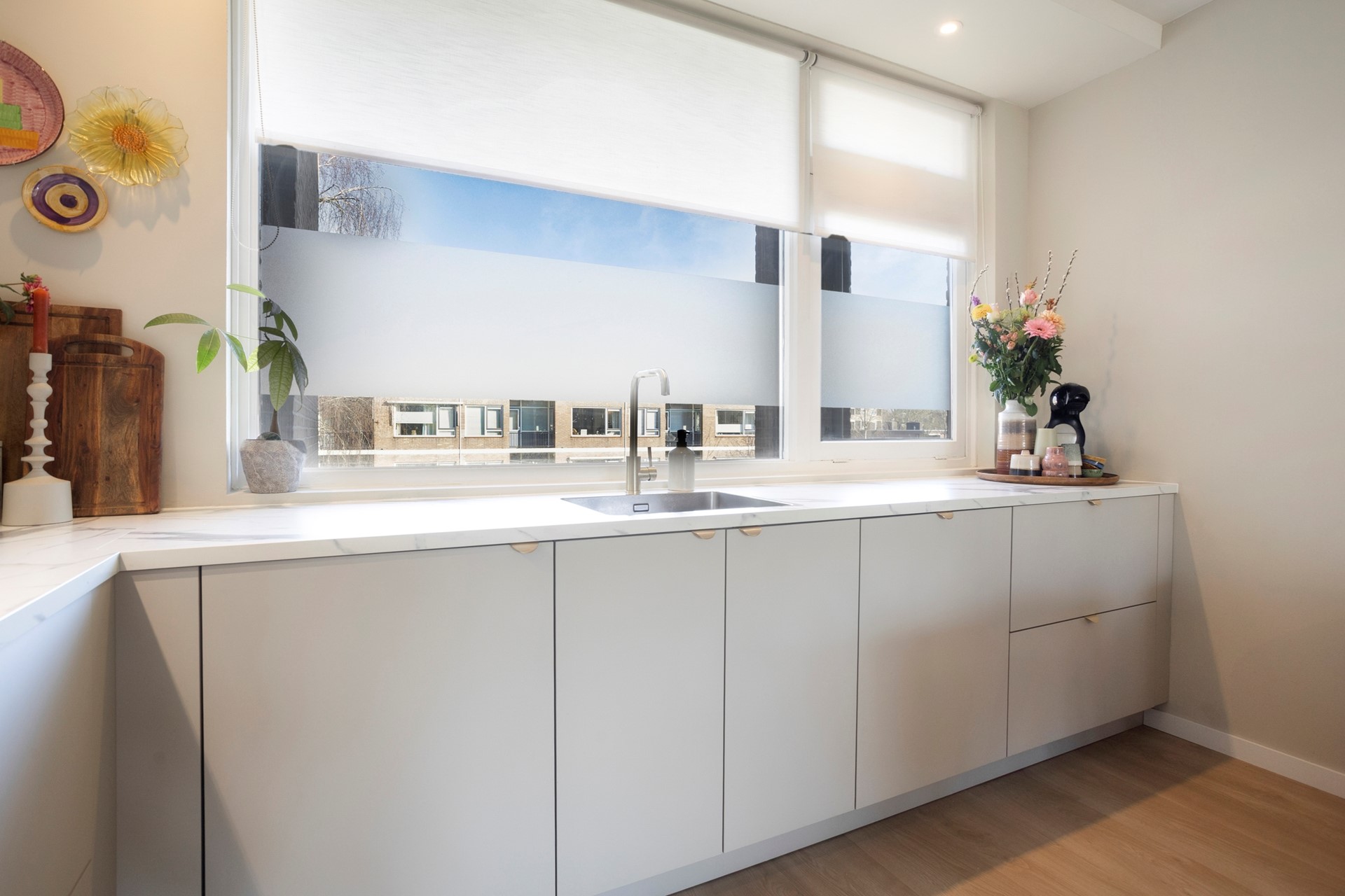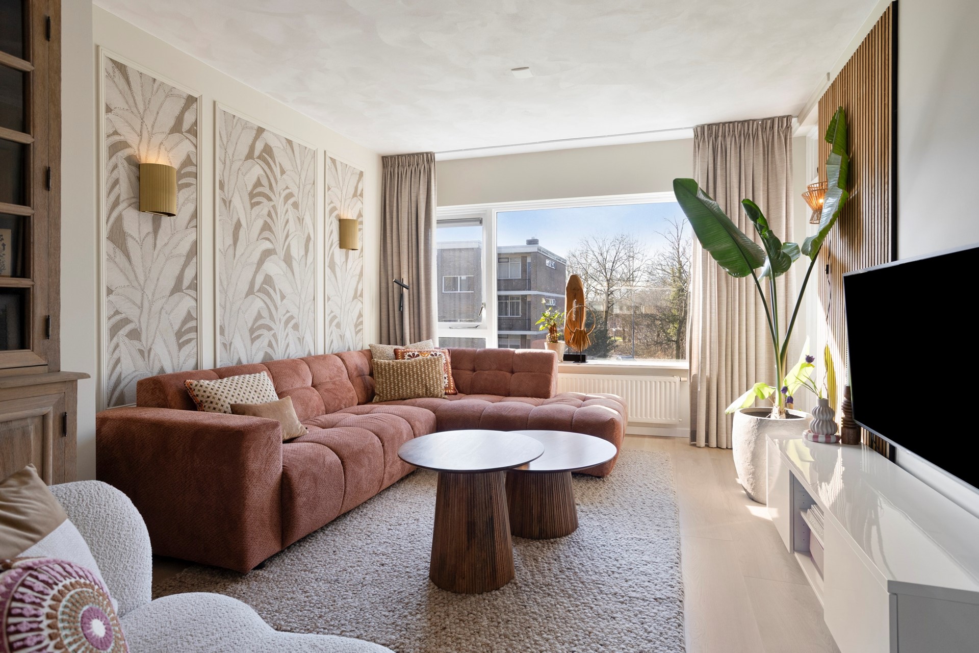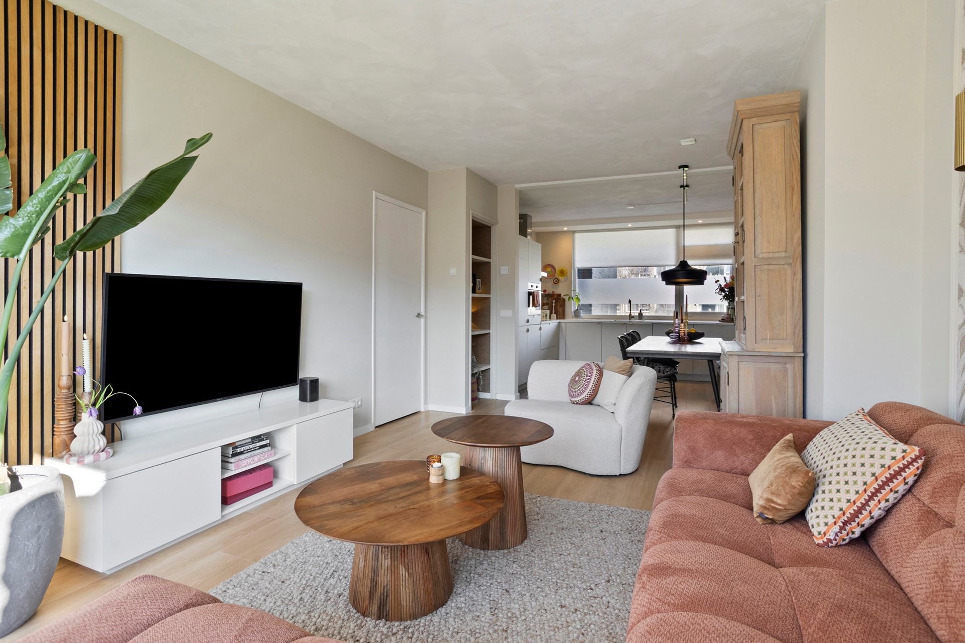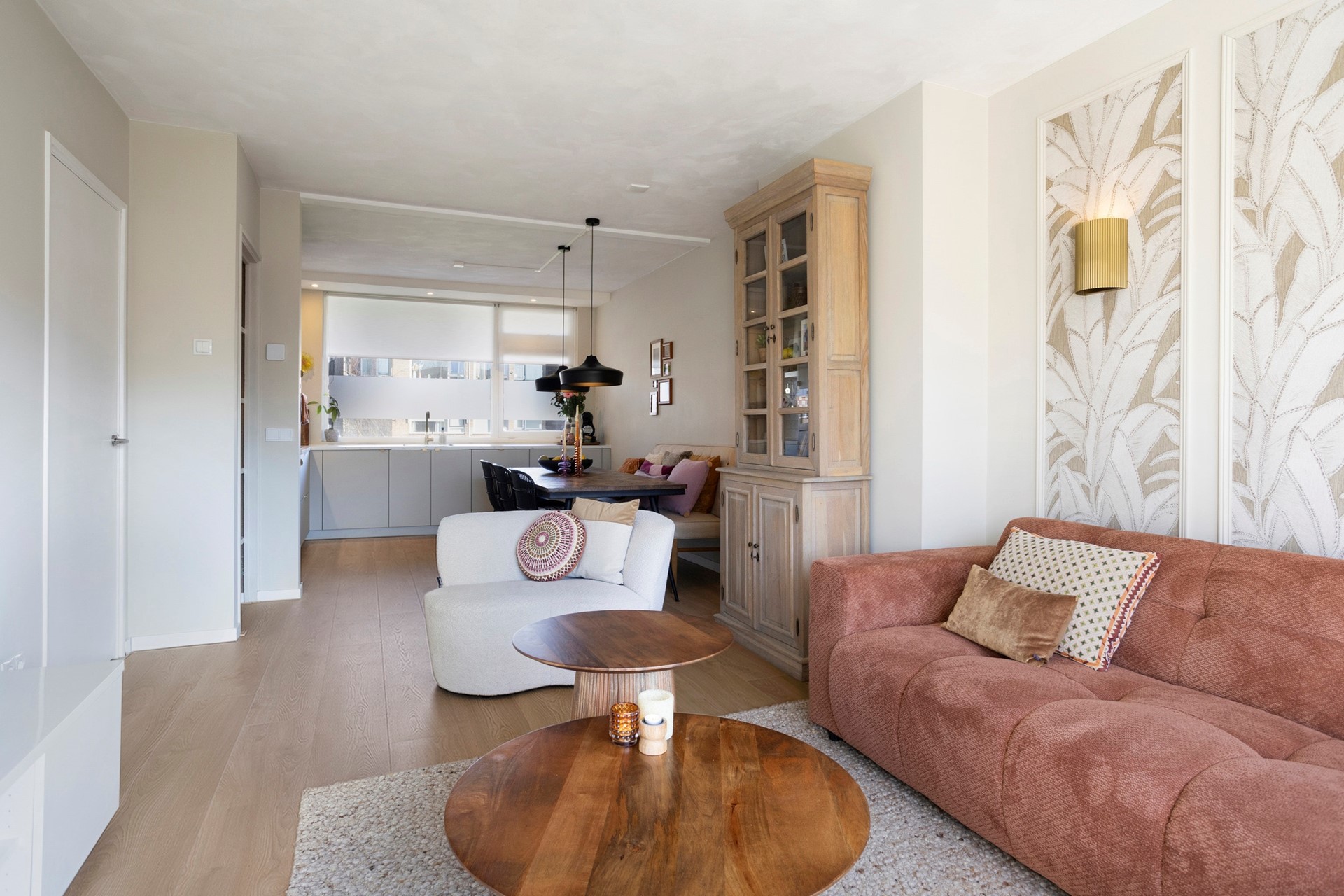 De woonkamer met open keuken is circa 33 m² groot. Dankzij de grote raampartijen geniet je hier van een prettige lichtinval. Wat dit appartement uniek maakt ten opzichte van andere woningen in het complex, is de slimme herindeling: in 2022 is er een volledig nieuwe, grote keuken geplaatst in de voormalige eetkamer. Zo is er optimaal gebruik gemaakt van de ruimtes.