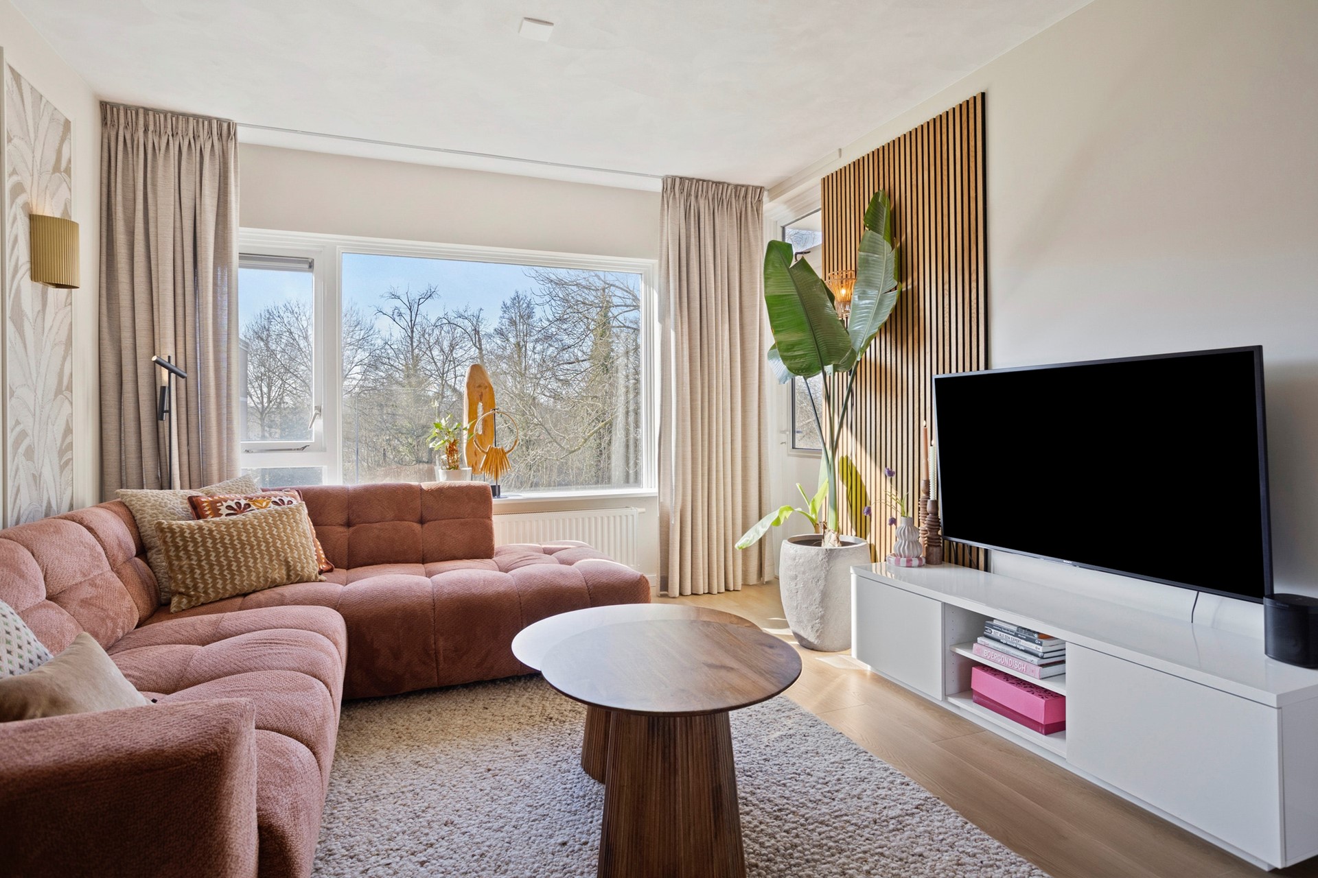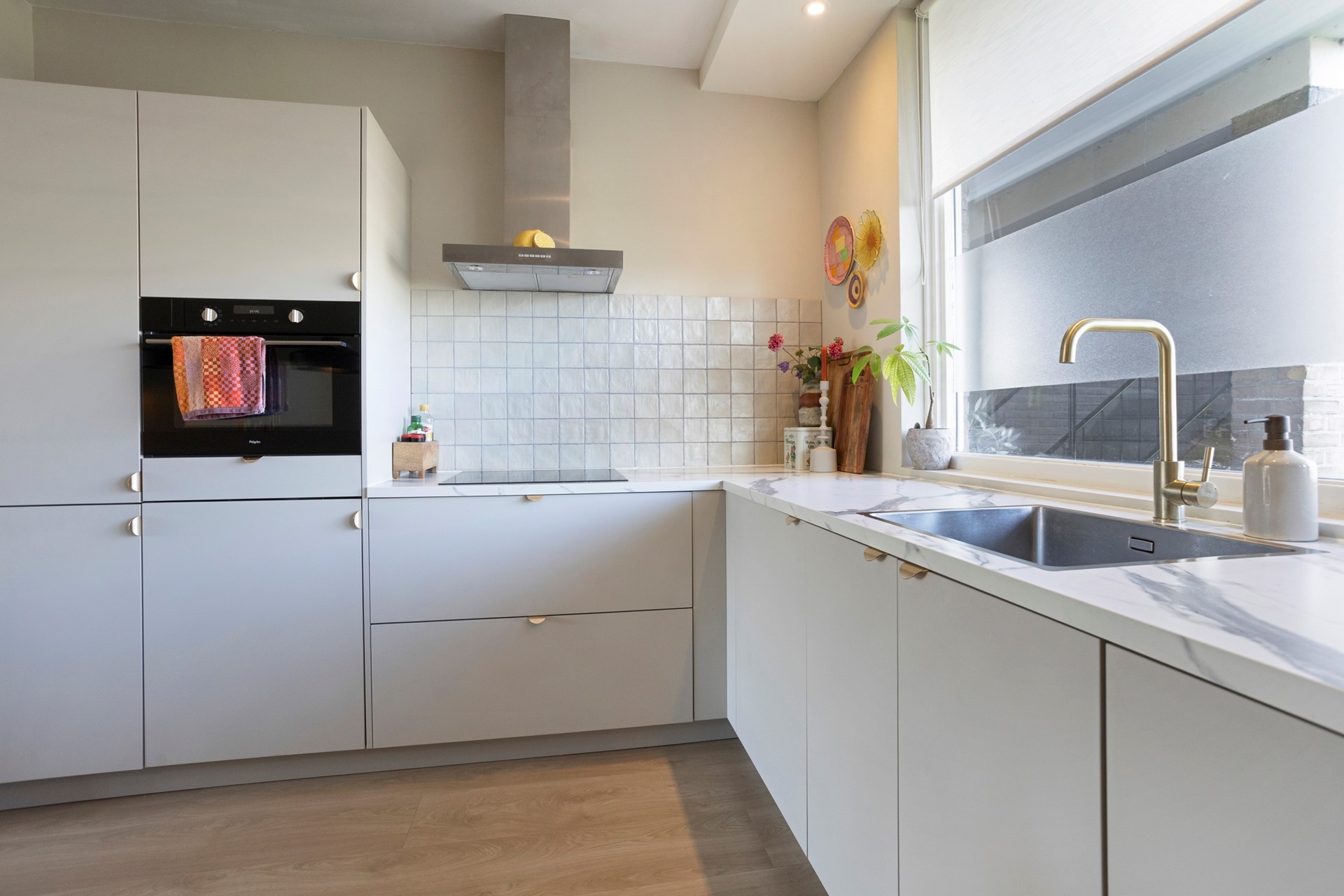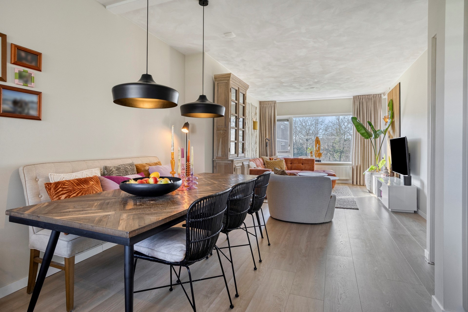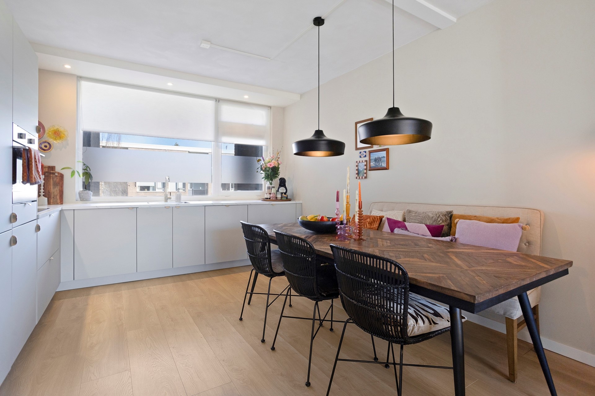 De woonkamer met open keuken is circa 33 m² groot. Dankzij de grote raampartijen geniet je hier van een prettige lichtinval. Wat dit appartement uniek maakt ten opzichte van andere woningen in het complex, is de slimme herindeling: in 2022 is er een volledig nieuwe, grote keuken geplaatst in de voormalige eetkamer. Zo is er optimaal gebruik gemaakt van de ruimtes.