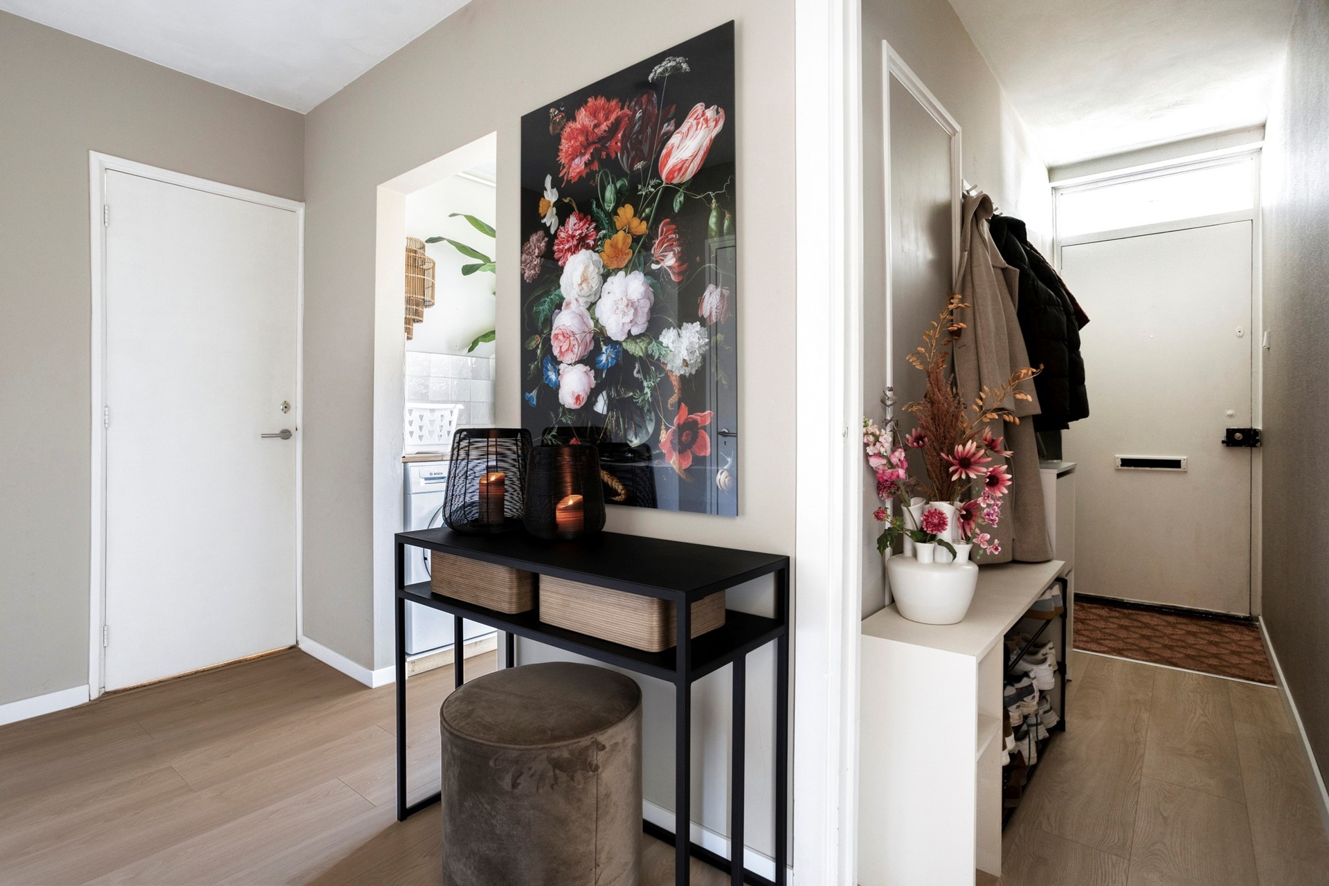 Via het portiek bereik je de galerij en de entree van het appartement. Bij binnenkomst kom je in de hal met ruimte voor een garderobe. Vanuit de ruime hal zijn de woonkamer met open keuken, twee slaapkamers, de badkamer, het separate toilet én een extra kamer. Deze extra kamer (ca. 8 m²) wordt momenteel gebruikt als wasruimte en berging, maar is dankzij de aanwezigheid van een raam en verwarming ook uitstekend in te richten als derde slaapkamer of werkkamer.