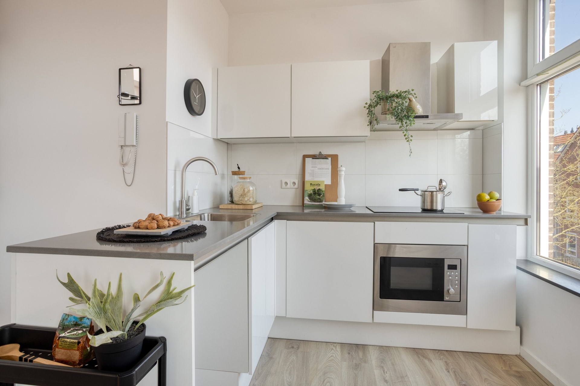 Via de gezamenlijke entree op de begane grond bereik je de trap naar de tweede verdieping, waar de entree van het appartement zich bevindt. Binnenkomst is in de lichte woonkamer met open keuken, waar de combinatie van grote ramen en een lichtkoepel zorgt voor een aangename en ruimtelijke sfeer. De indeling is praktisch en verzorgd, met vanuit de woonkamer toegang tot de slaapkamer, die beschikt over een en-suite badkamer met luxe afwerking. De keuken is geplaatst in 2020 en verkeert in goede staat, terwijl de rest van het appartement in 2026 grondig is gemoderniseerd. Vanuit de woonkamer stap je zo het balkon op, een fijne plek om even buiten te zitten.