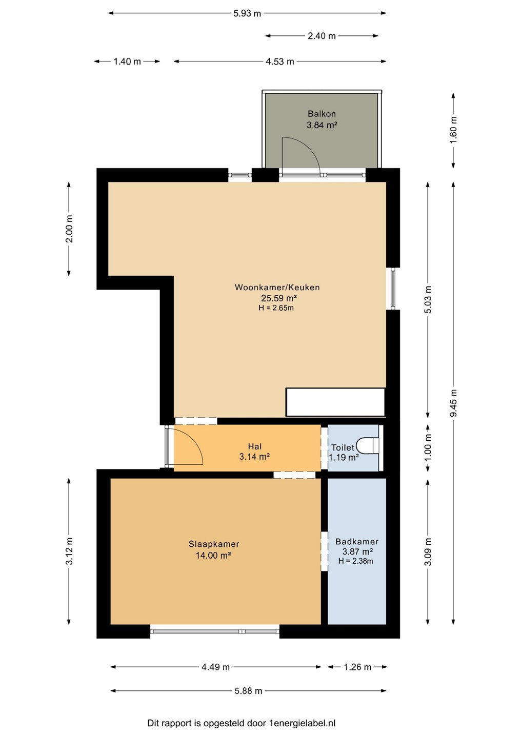 Globale indeling: Hal/entree met modern toilet. Woonkamer met openslaande deuren naar terras of balkon. Open keuken met moderne keukenopstelling v.v. enige inbouwapparatuur.