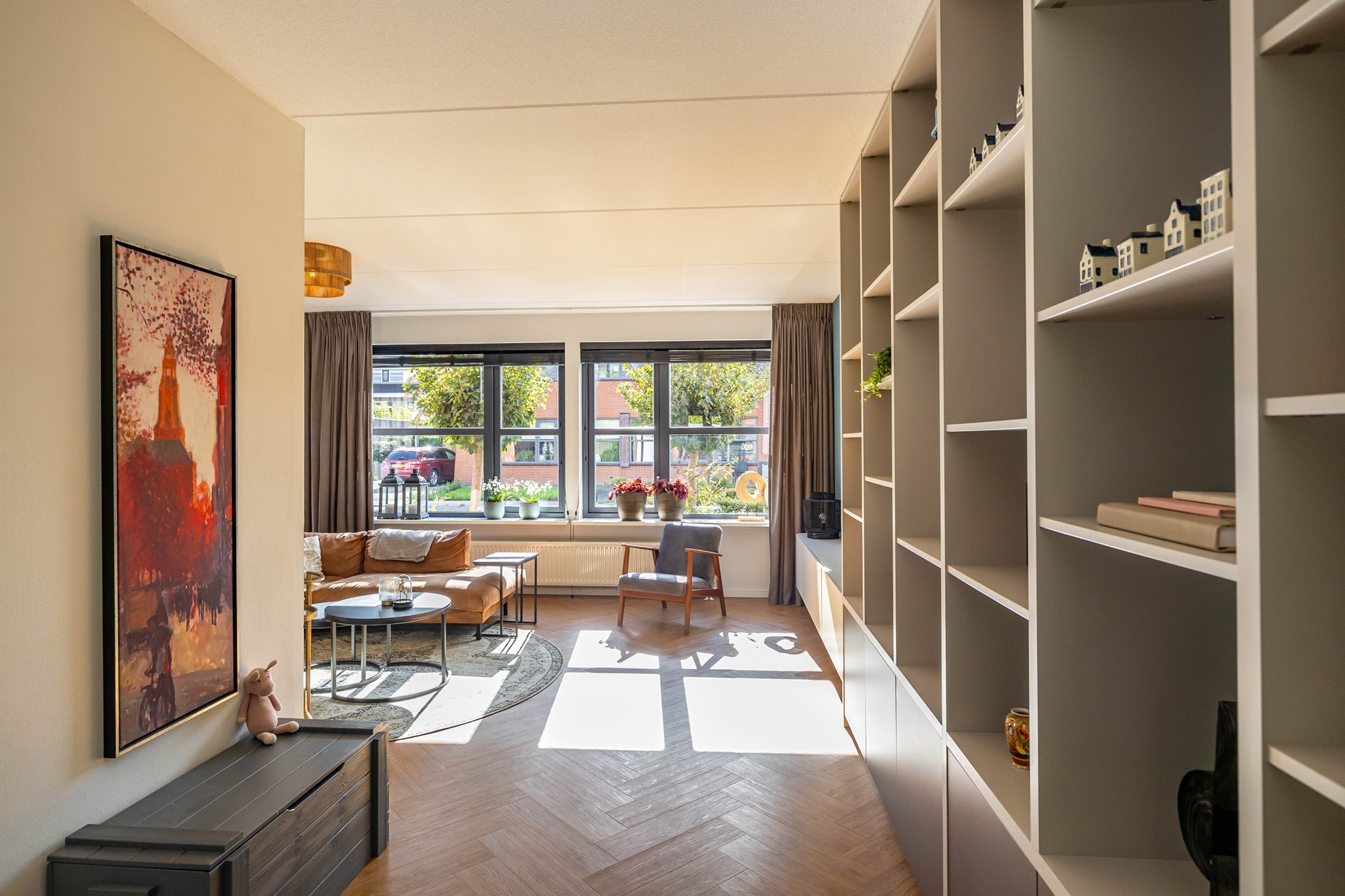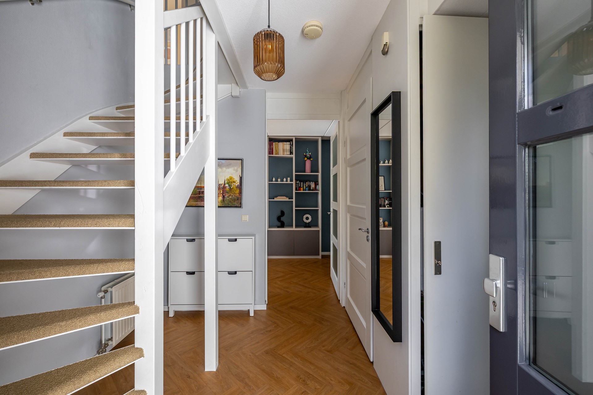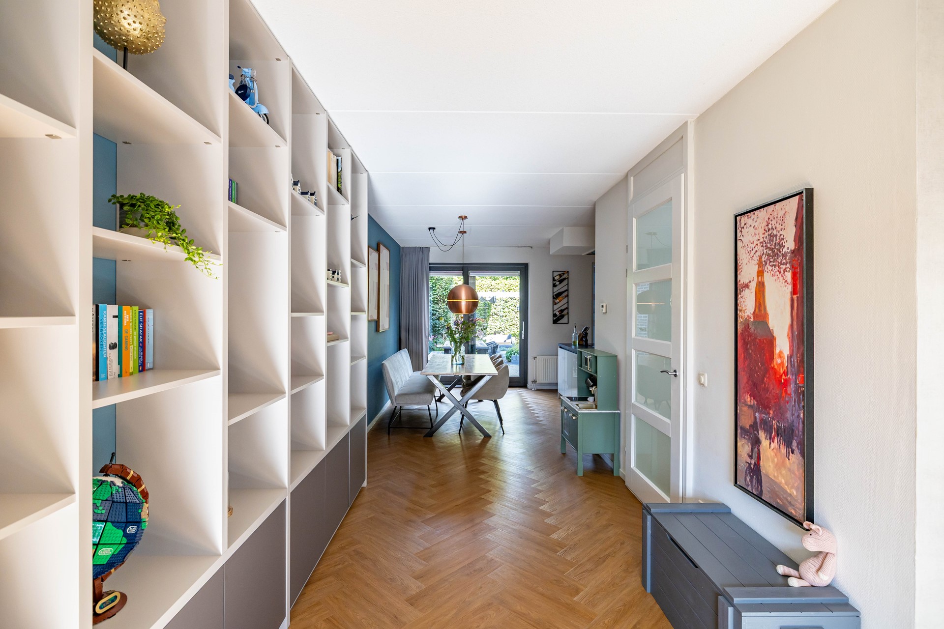 De woning heeft een vrije ligging op de kavel, waardoor de ruimte rondom goed benut wordt. Er is een diepe voortuin die wat afstand tot de rustige straat creëert, een brede oprit richting de aangesloten garage en een diepe achtertuin met verschillende terrassen op het zonnige zuiden. De woonkamer heeft zijramen, waardoor er extra veel licht in huis valt. De keuken en sanitaire ruimtes zijn modern en passend binnen de huidige trends. Mooie details in de gehele woning laten zien dat er veel zorg aan het interieur is besteed. Daarnaast is de woning praktisch met een grote garage en handige bijkeuken. De vier slaapkamers + een werkkamer (overloop tweede verdieping) bieden mogelijkheden voor grote gezinnen en thuiswerkers. Tot slot is er een ruime bergzolder.